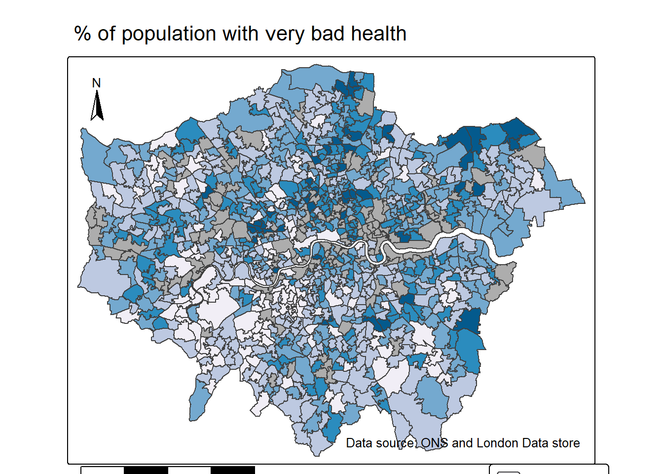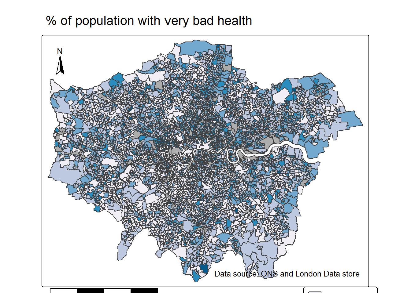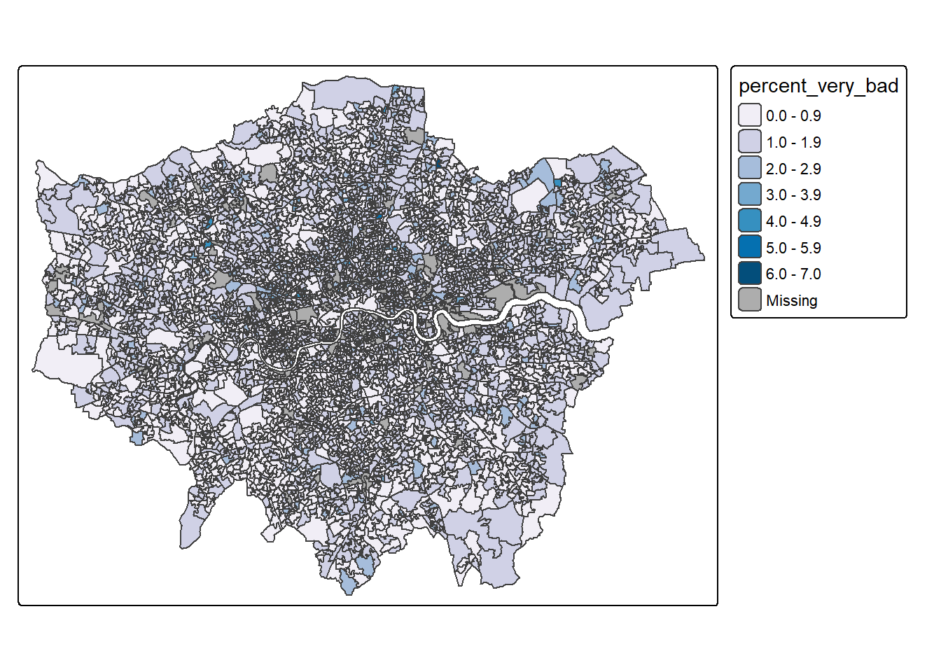 tmap_save(tm1, 'very bad health.png')This hasn’t solved the LSOA issue - whereby the map is challenging to read due to the spatial units used. We can consider aggregating our units to MSOA as that column is provided within the LSOA data…