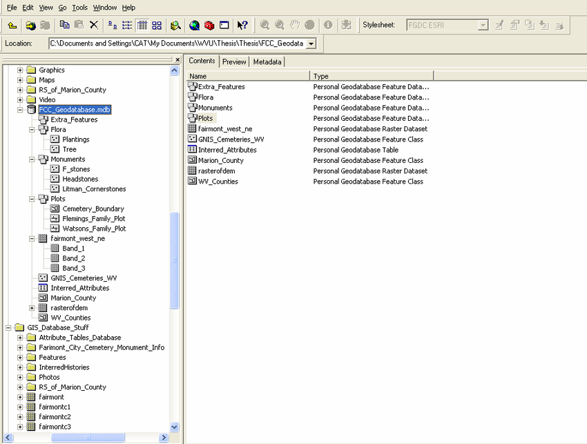 A geodatabase is a collection of geographic data held within a database. Geodatabases were developed by ESRI to overcome some of the limitations of shapefiles. They come in two main types: Personal (up to 1 TB) and File (limited to 250 - 500 MB), with Personal Geodatabases storing everything in a Microsoft Access database (.mdb) file and File Geodatabases offering more flexibility, storing everything as a series of folders in a file system. In the example below we can see that the FCC_Geodatabase (left hand pane) holds multiple points, lines, polygons, tables and raster layers in the contents tab.