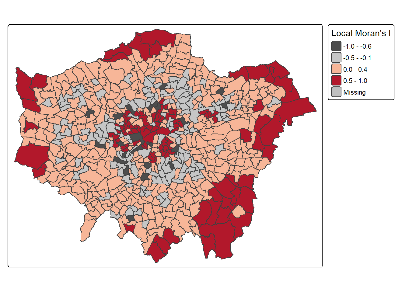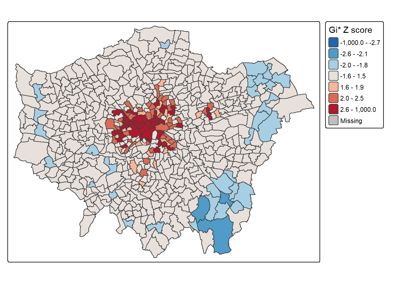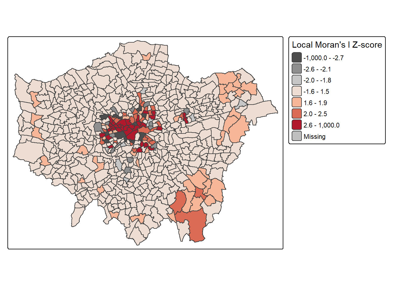 - where there are intense high/low values (e.g. Getis Ord \(G_{i}^{*}\) )